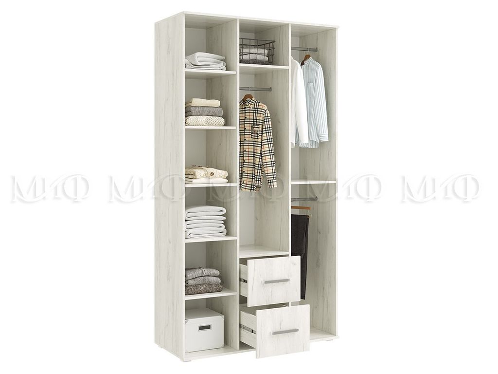 Под центральной створкой у данной модели шкафа находятся два выкатных ящика, внутренняя комплектация состоит из отделений с хромированными штангами и зоны с полками для хранения трикотажа или белья.